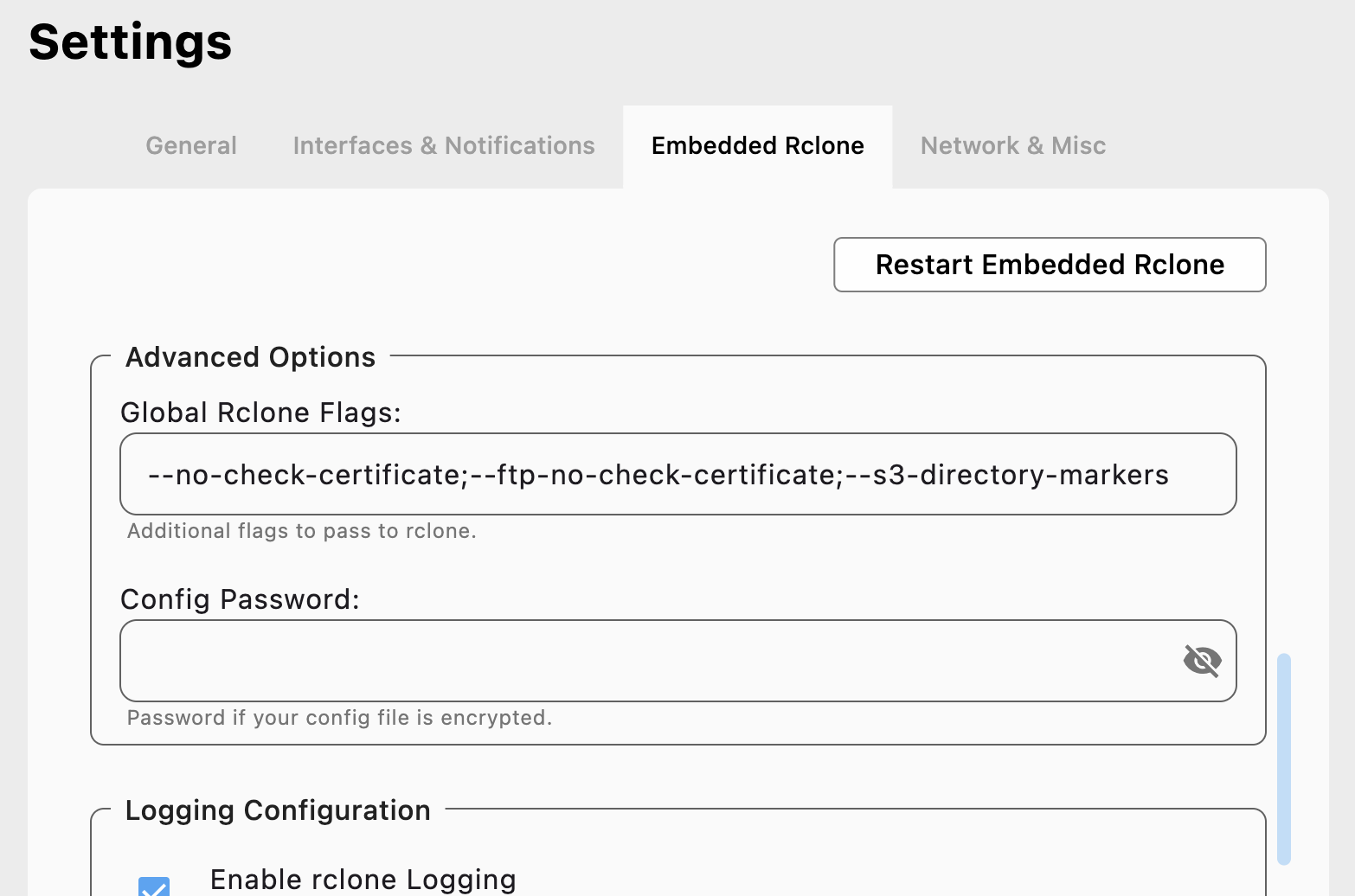 Go to Settings → Embedded Rclone → Advanced Options → Config Password, enter the same password, then click Restart Embedded Rclone.