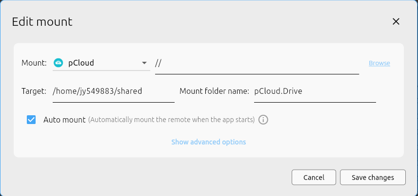 rclone mount pCloud: /home/jy549883/shared/pCloud.Drive --vfs-cache-mode full &