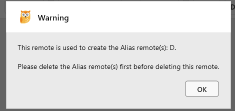I can change the Remote value to anything, the alias “D” will work on my D:/ disk anyway. However I can only delete the D Alias remote, if I in Edit Alias window, I edit the remote value back to “Local:” If I leave it on “D:/”, and try to delete remote, I get this warning:
